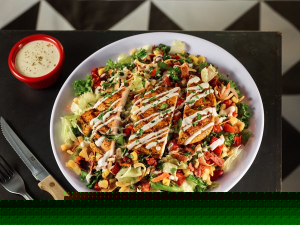 Onion rings, cheddar cheese, BBQ sauce, jalapenos, lettuce, smoky mayo