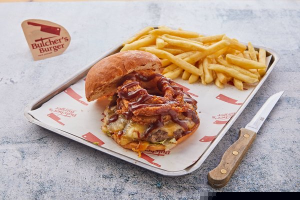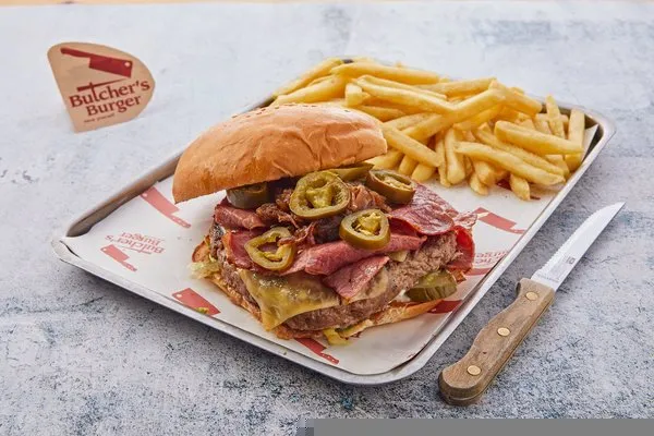 300 gm, double cheese, beef bacon, caramelized onions, jalapenos, lettuce, pickles, garlic mayo