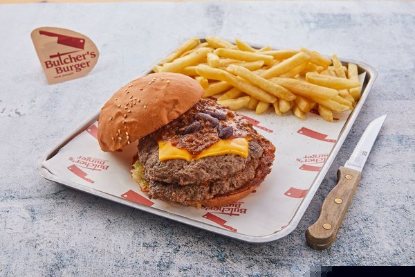 Double patties loaded with melting red cheddar cheese, chili con carne, pickles, lettuce, mayo