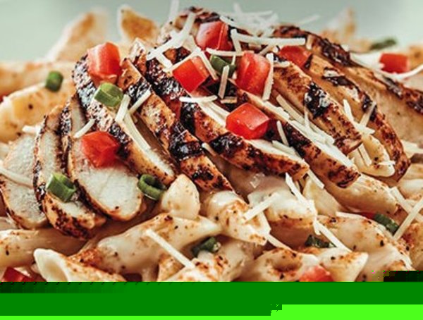 Cajun PastaPenne in alfredo sauce, topped with chile spices, parmesan, tomatoes, green onions, served with garlic toast, voted most popular by its peers |