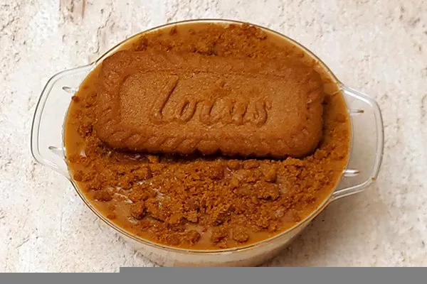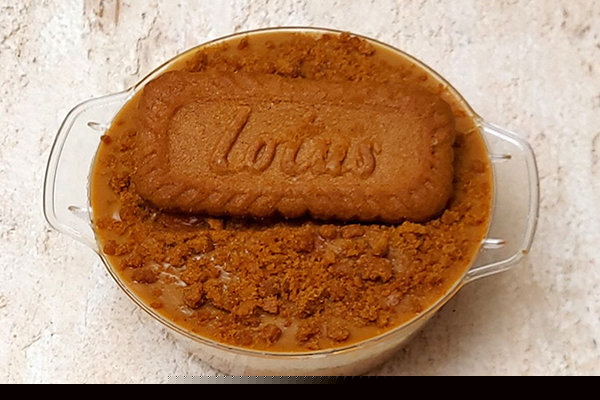 Chopped konafa with nutella, hazelnut, maltesers, mango slices, cream, lotus paste and lotus biscuit