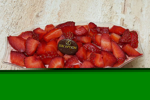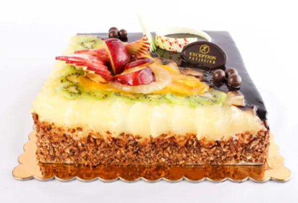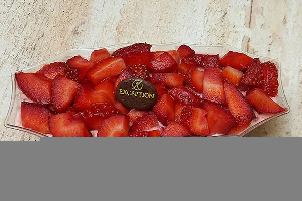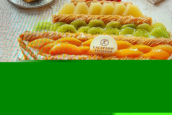 Konafa with cream and mixed fruits, kiwi, peach, strawberry, pineapple, cherry