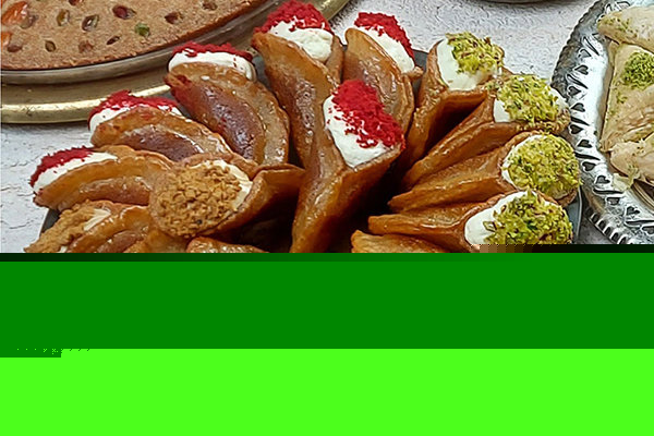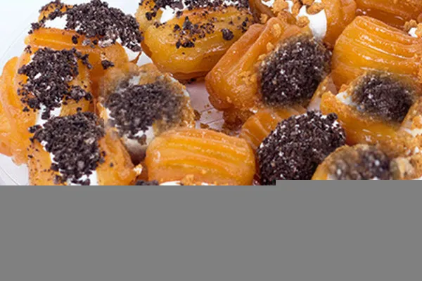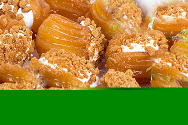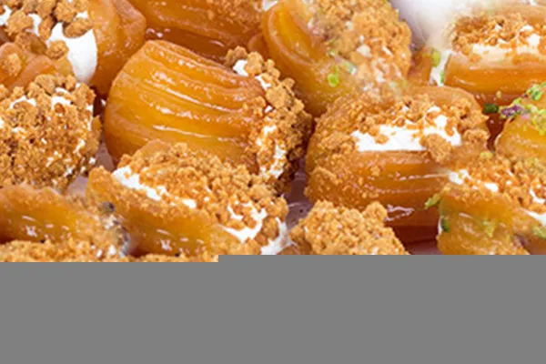 Chopped konafa with caramel sauce, delicious profiterole pieces with hazelnuts and dates