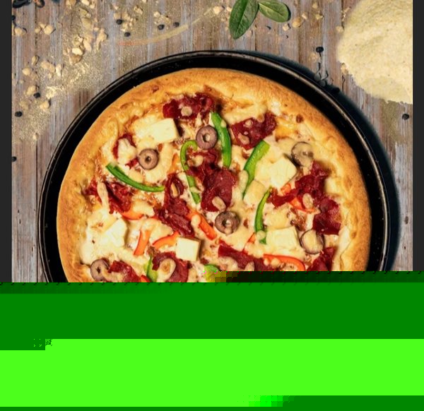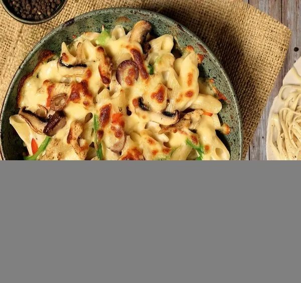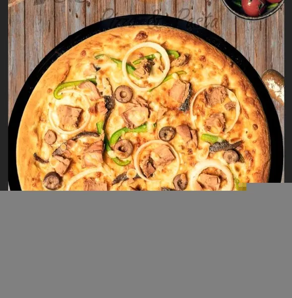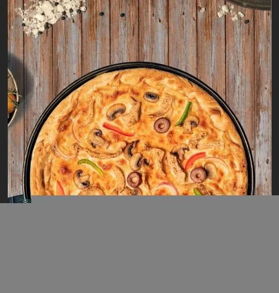 Chicken breasts, mushroom, mozzarella, colored pepper, onion, olives, pizza sauce