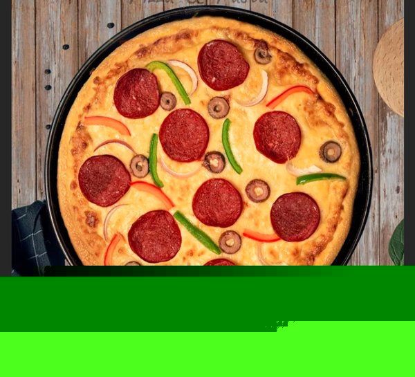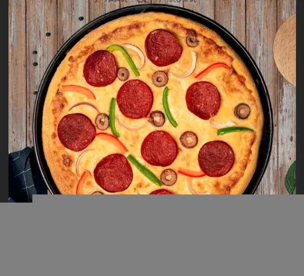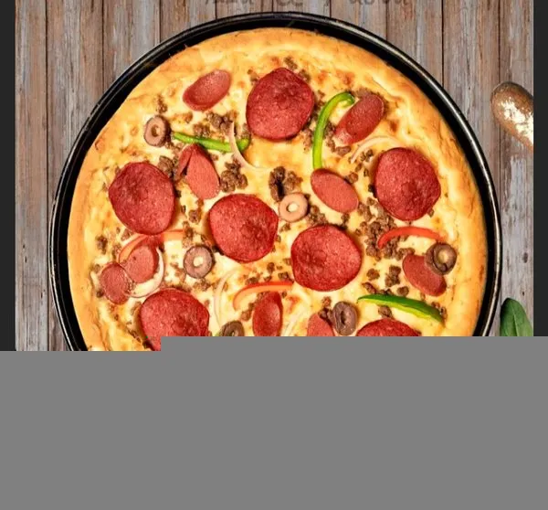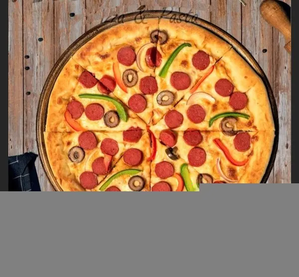 Pepperoni, mozzarella, colored pepper, onion, olives