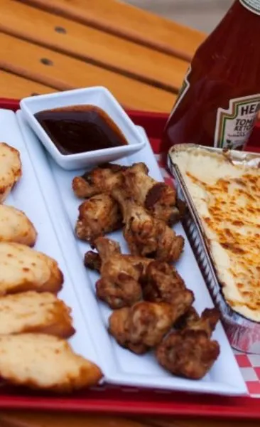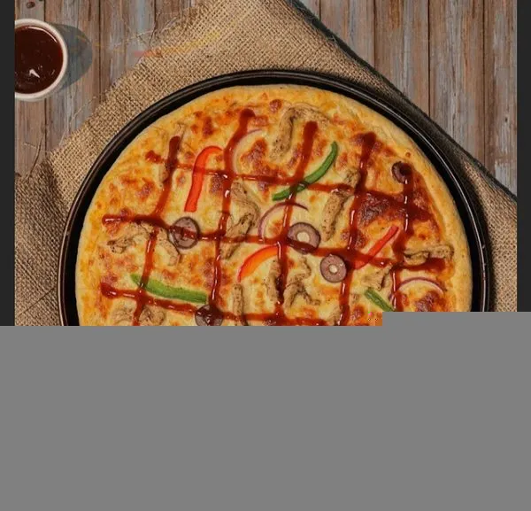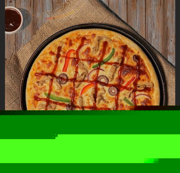 Chicken breasts, mozzarella, colored pepper, onion, olives, BBQ sauce