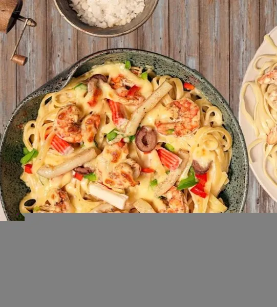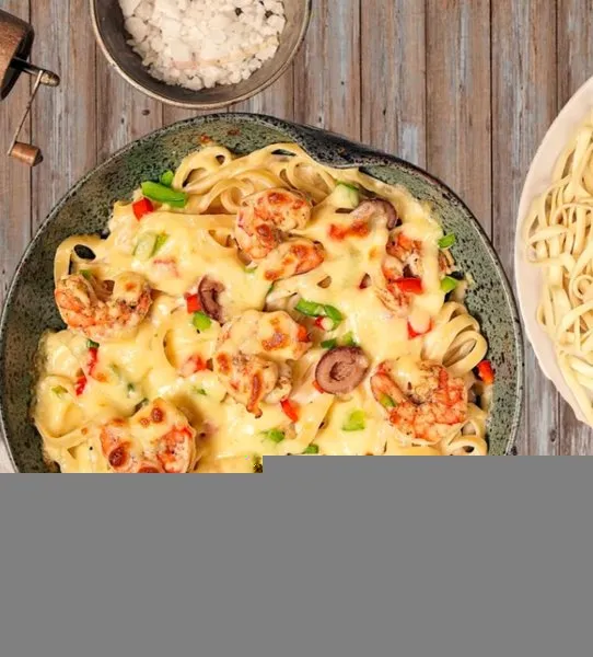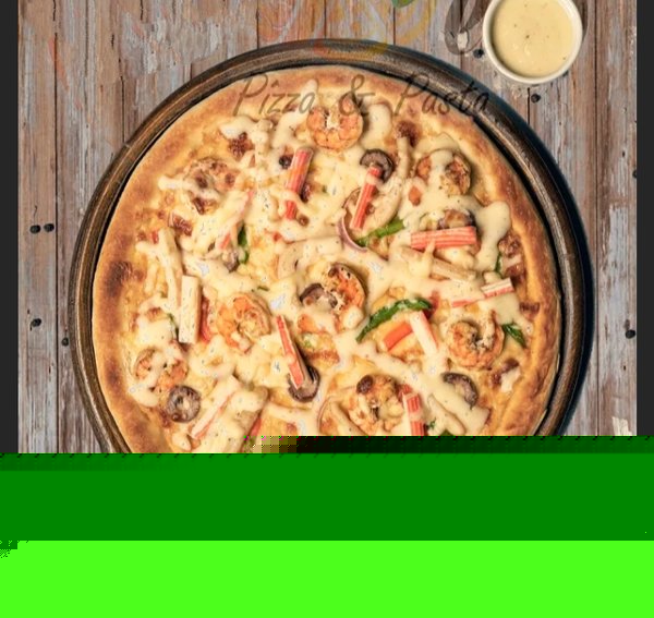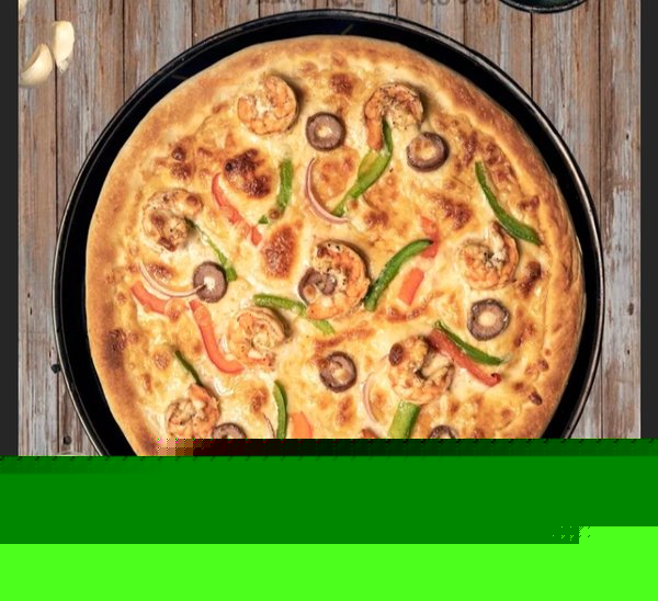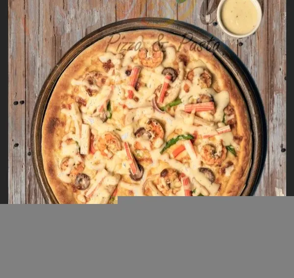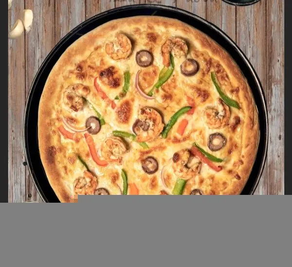 Shrimp, calamari, crab, colored pepper, onion, olives, mozzarella, ranch sauce