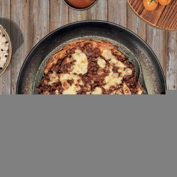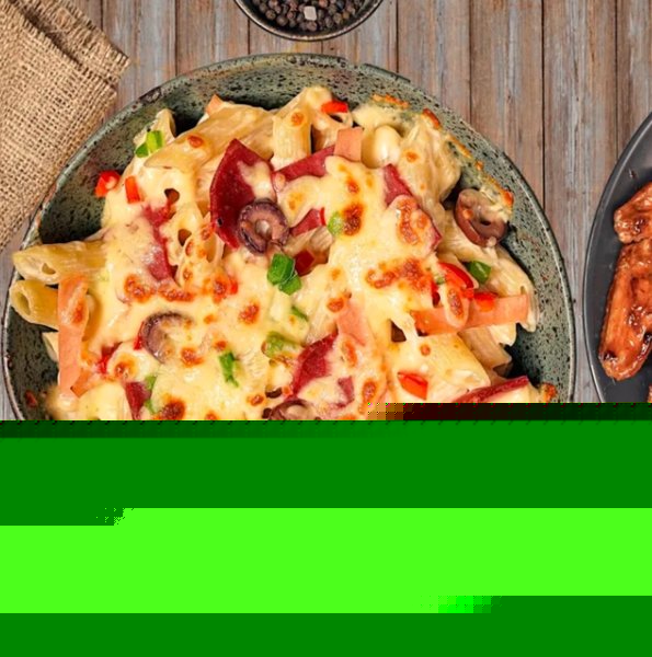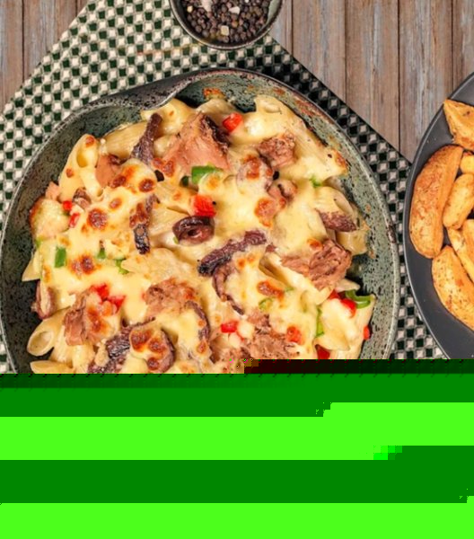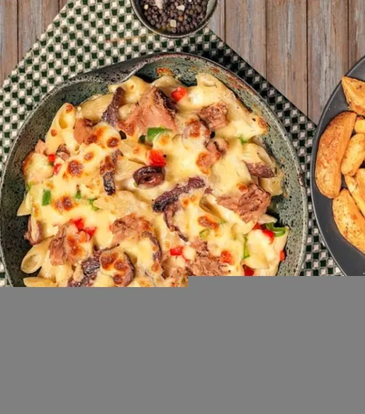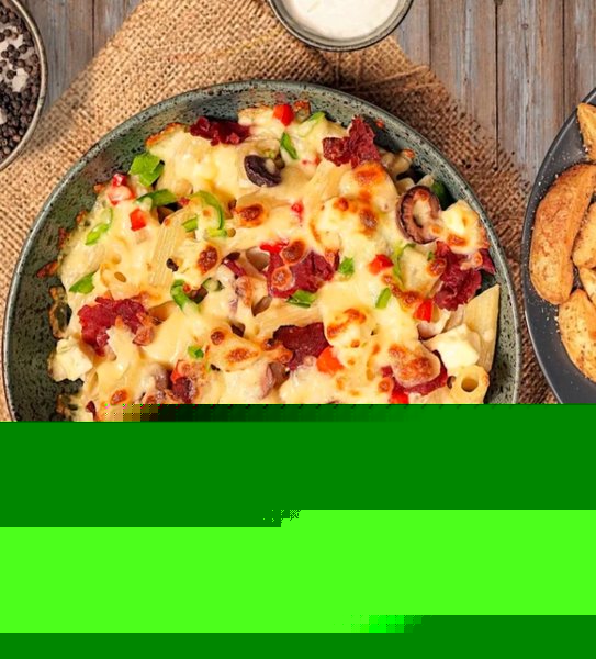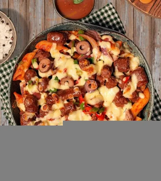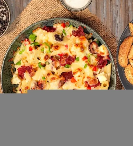 Pastrami, kiri cheese, mozzarella, colored pepper, olives