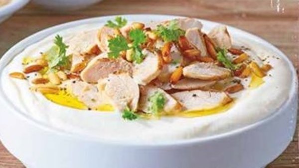 Fried veal mouza with vinegar & garlic tasha, fattah rice, fattah sauce