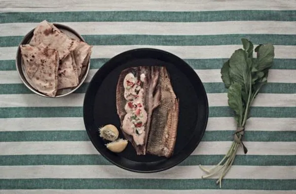 Slices of smoked herring fillet, lettuce, rocca, spring onions with lemon dressing