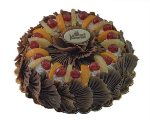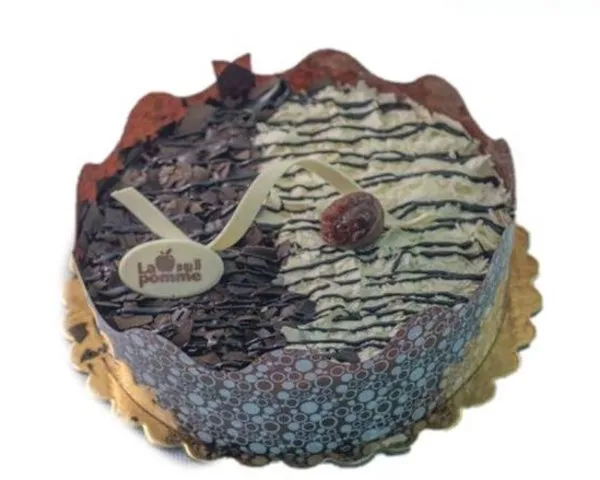 Chocolate sponge cake, vanilla whipped cream topped with chocolate and cherry