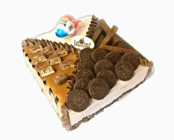 Tart stuffed with white and chocolate mousse, caramel, peanut butter and snickers