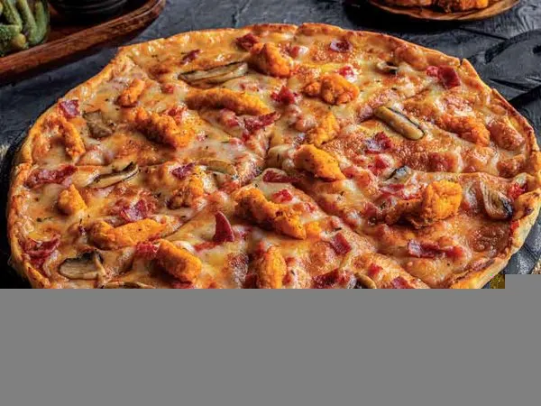Fried chicken, pepperoni & hot buffalo sauce, mushrooms