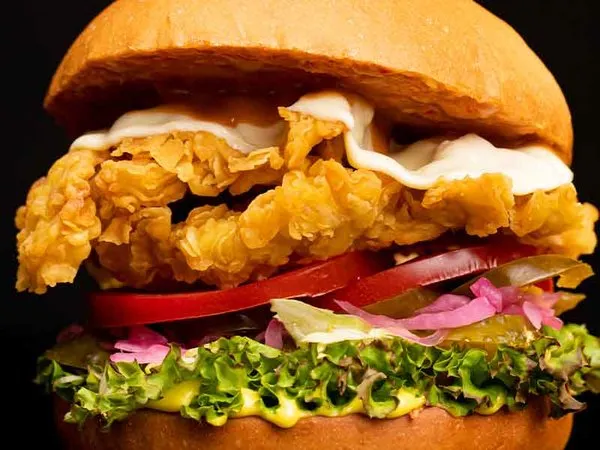 Two layers of crispy fried chicken breasts with melted cheese, lettuce, tomato, and pickled cucumber with big boss sauce