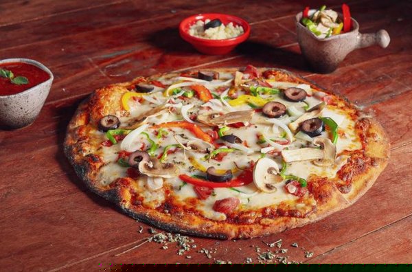 Grilled chicken, shrimp, smoked beef, mushrooms, colored peppers, colored olives, fresh thyme, mozzarella cheese and pizza sauce