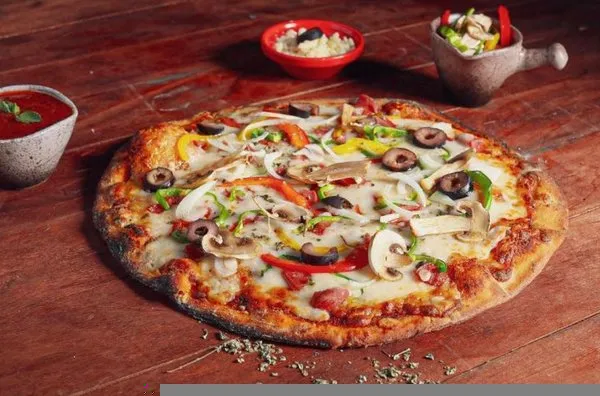 Mushrooms, black olives, colored peppers, fresh thyme, mozzarella cheese and pizza sauce