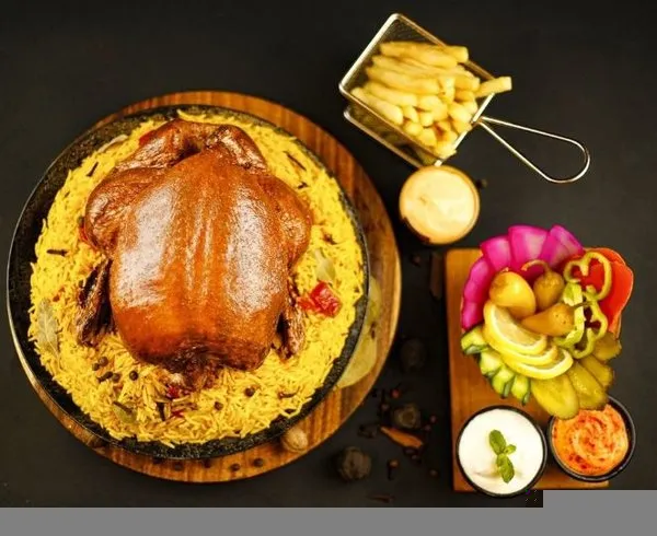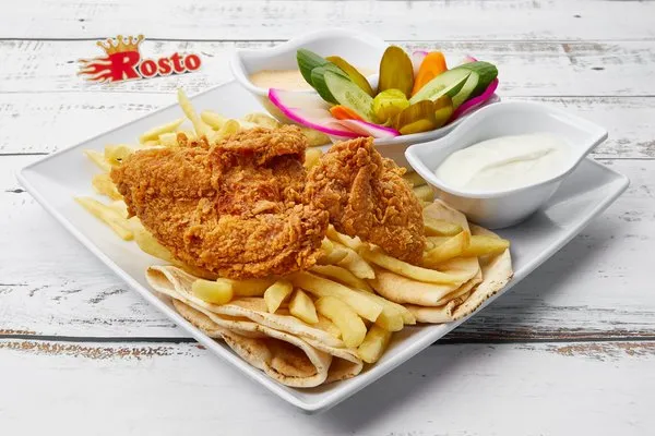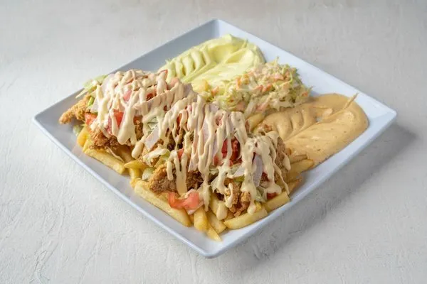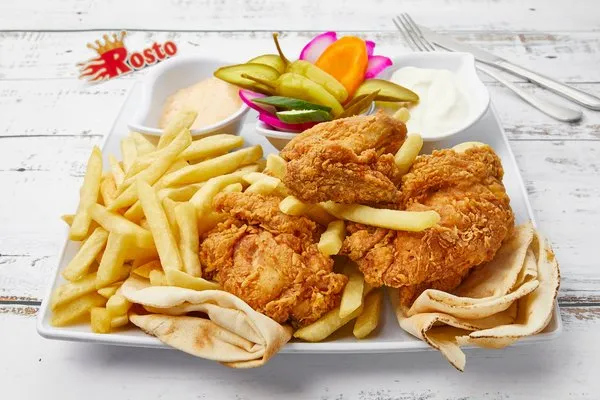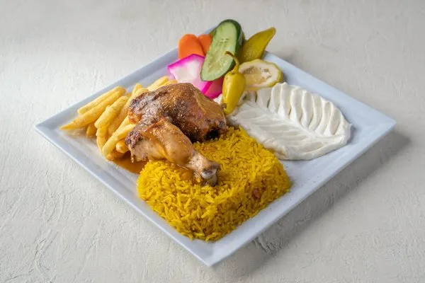Charcoal Grilled ChickenGarlic dip, pickles, fries, rice, bread |
