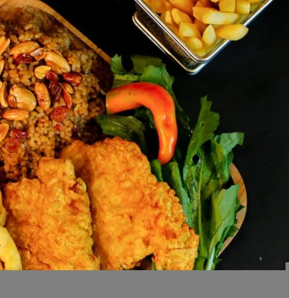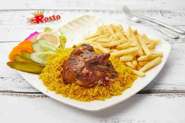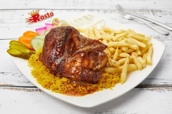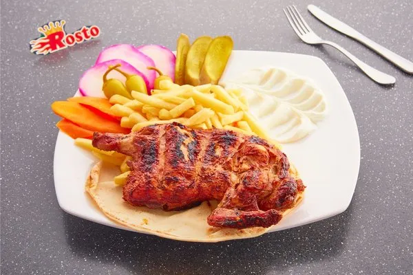 Half Charcoal Grilled ChickenGarlic dip, pickles, fries, rice, bread |