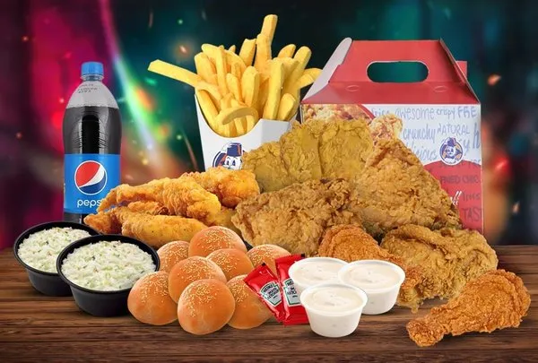 Served with 2 large fries, 3 coleslaw, 4 garlic dip, 14 bread and 2 liter pepsi