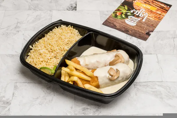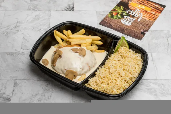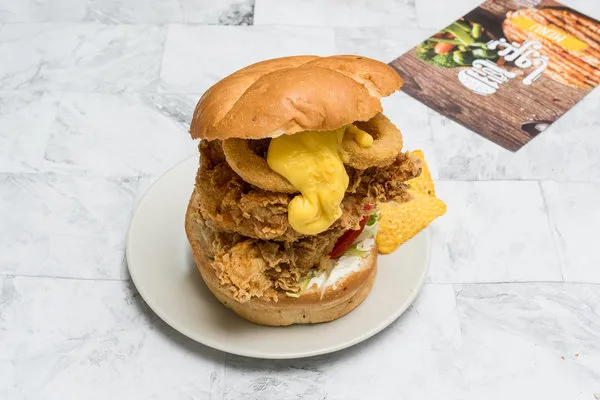 2 chicken breasts, cheddar sauce, smoked turkey, onion rings, BBQ, mayonnaise & bread with sesame