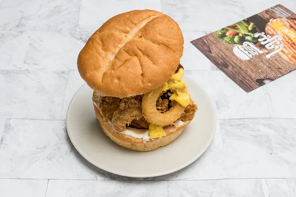 Chicken breast, onion rings, mayonnaise, lettuce, BBQ & bread with sesame