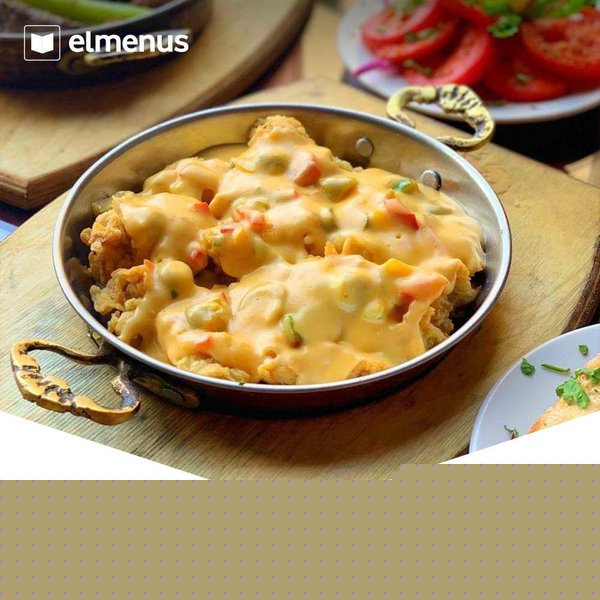 Fried chicken with cheese sauce, served with bread & fries