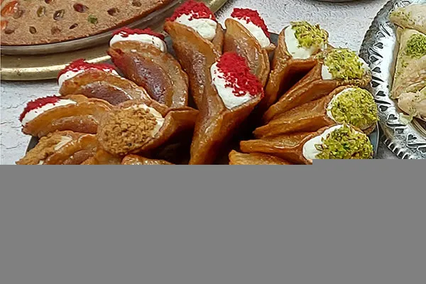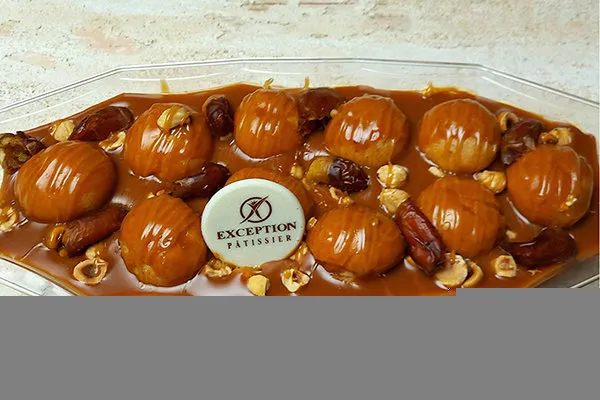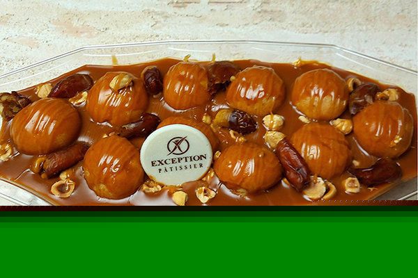 Chopped konafa with caramel sauce, delicious profiterole pieces with hazelnuts and dates