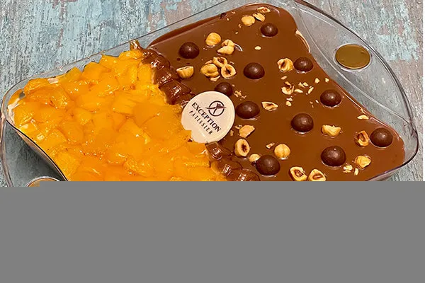 Chopped konafa with nutella, hazelnut, maltesers, mango slices and cream