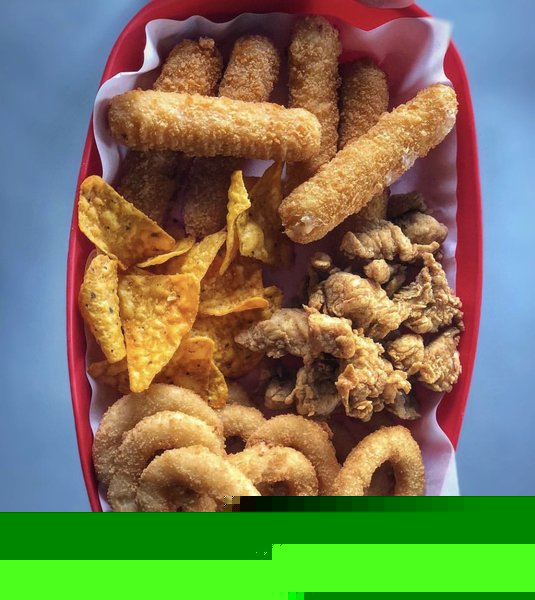 3 mozzarella sticks, 3 bomers, 10 onion rings, pop corn and doritos