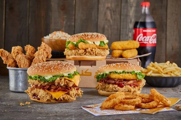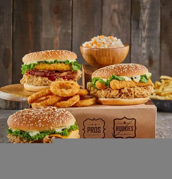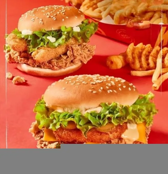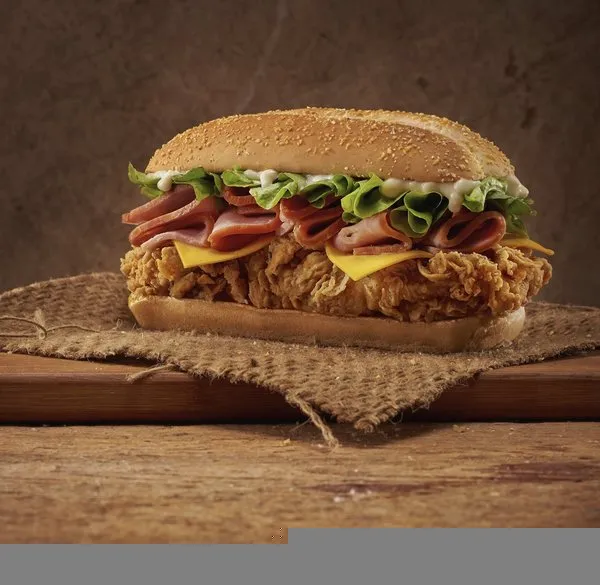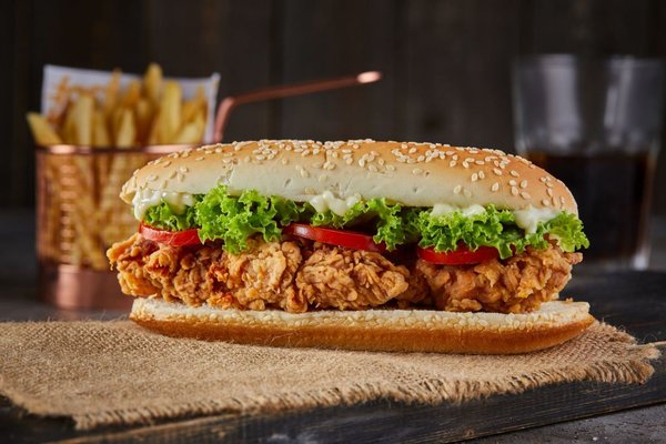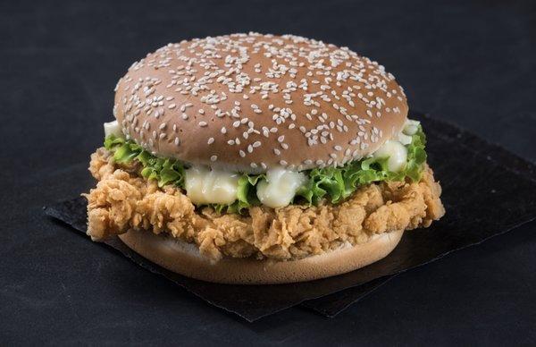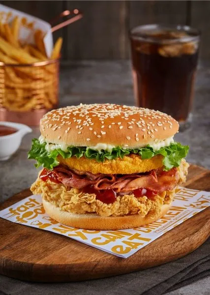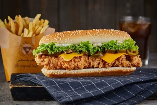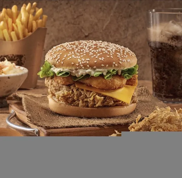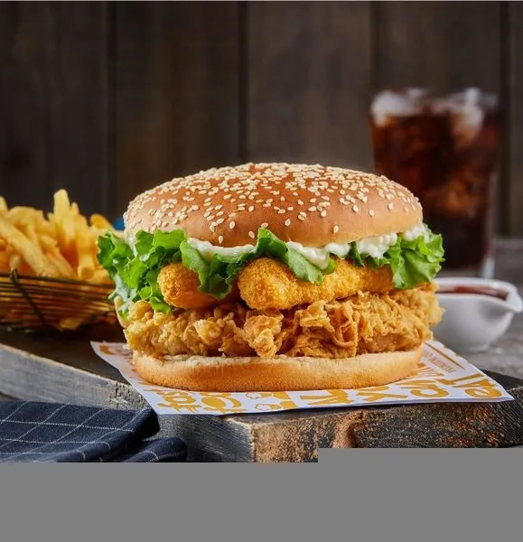 Chicken breasts, hash brown, 2 cheese, pickles, BBQ sauce, South sauce, pepper sauce and bread with sesame
