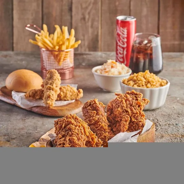 8 chicken pieces, 8 crispy strips pieces, 4 arizo, family fries, large coleslaw, 4 buns, large garlic dip and drink liter
