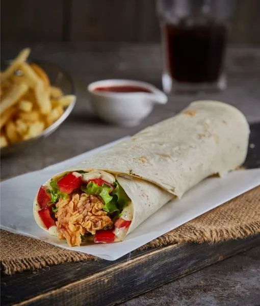 2 crispy chicken breast strips, tomatoes, mayonnaise with pepper, lettuce and tortilla bread