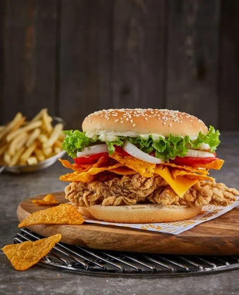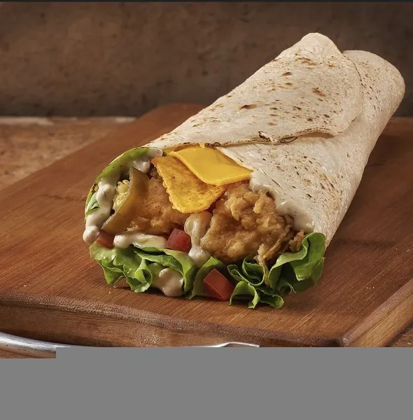 2 crispy chicken breast strips, tomatoes, doritos, jalapeno cheese, mayonnaise with pepper, lettuce and tortilla bread