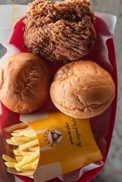 1 large chicken piece, 1 small chicken piece, fries, bread and rice