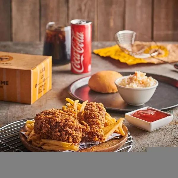 2 chicken pieces, large fries, rice, coleslaw, bun, garlic dip and drink