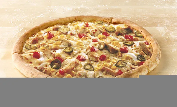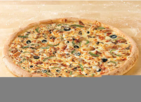 Grilled chicken, chicken sausage, chicken pepperoni, fresh mushroom, onion, green pepper and black olives