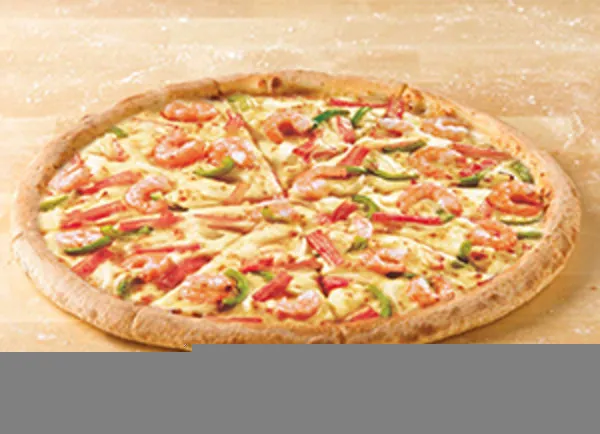 Shrimp, calamari, green pepper and onion with pizza sauce
