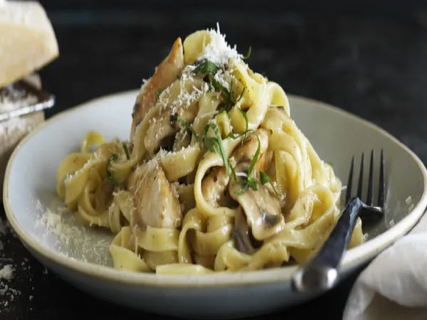 Creamy mushroom fettuccine with chicken topped with parmesan cheese