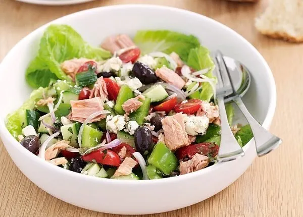 Tuna chunks mixed with lettuce and onion, bell peppers, cherry tomatoes and vinegar