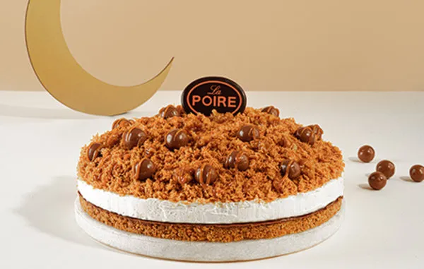 Layer of La Poire konafa, 1/2 lotus cream with lotus biscuits, 1/2 nutella fudge, caramel cream, pieces of fudge cake covered with nutella garnished with layer of nutella, caramelized hazelnuts, maltesers chocolate