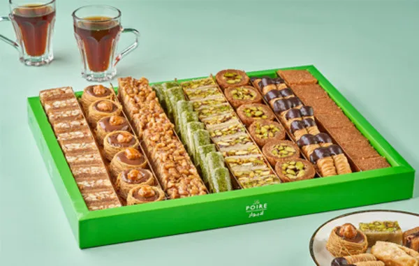 Layer of La Poire konafa othmanlya stuffed with La Poire cream garnished with pistachio, almond, pistachio croquant