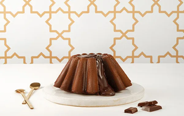 Layer of basbousa with baladi samna, white chocolate, La Poire baklava, garnished with crushed pistachio
