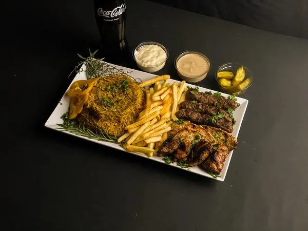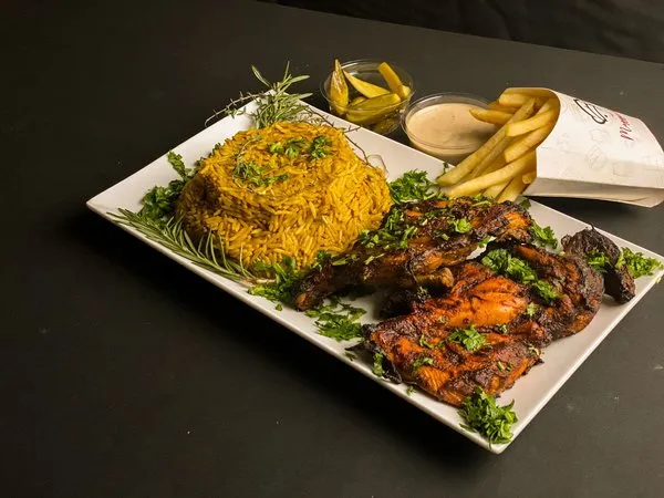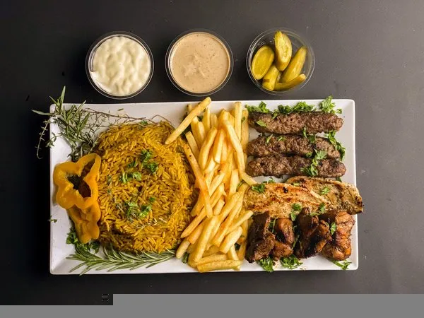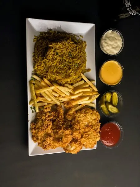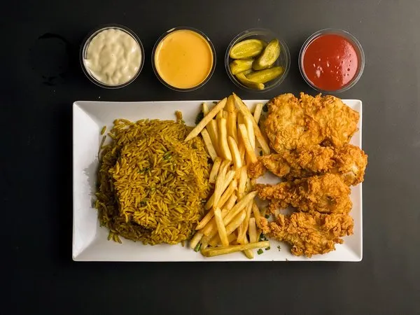 Served with basmati rice, fries, pickled cucumber and your choice sauce