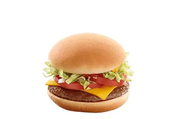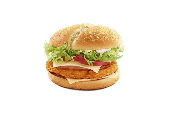 A gently spiced breaded chicken patty garnished with freshly cut lettuce, one slice of melty cheese, a fresh tomato slice and mayonnaise all wrapped in a freshly baked bun