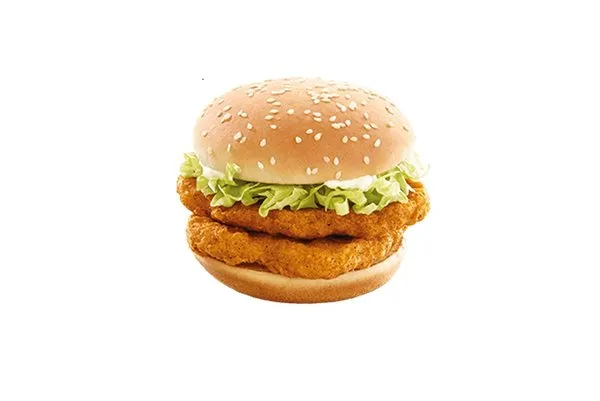 Two delicious crispy chicken patties topped with mayonnaise, shredded lettuce, and served in a perfectly toasty sesame seed bun