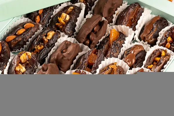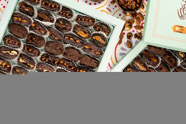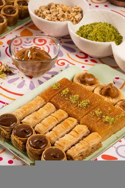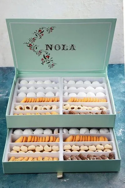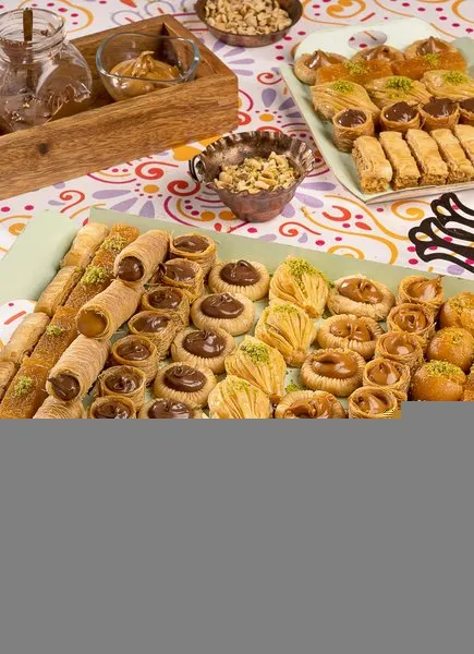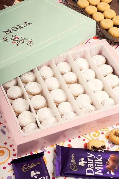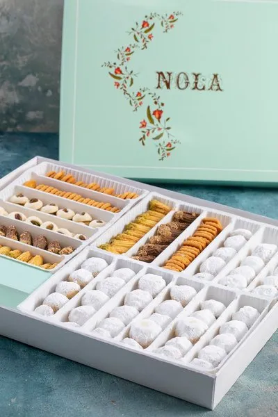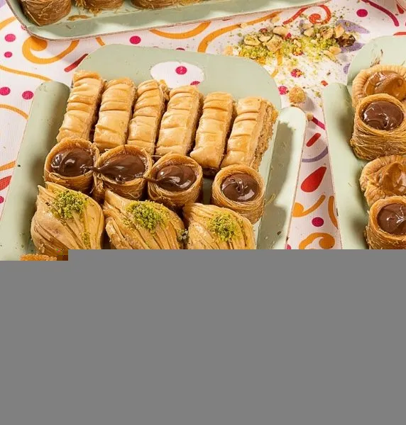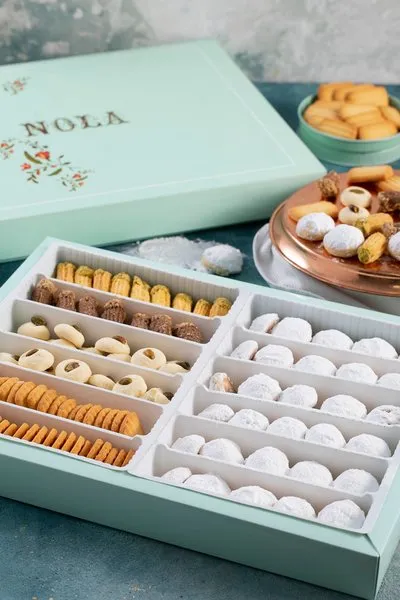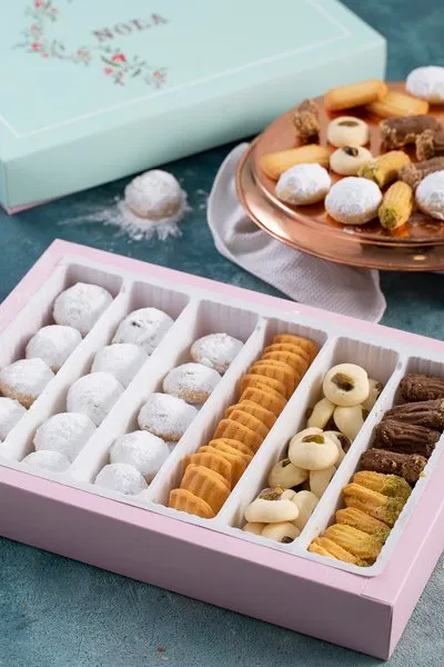 Plain kahk, kahk with malbn, kahk with ajwa, vanilla petit four with pistachio, petit four with hazelnut chocolate, ghouriba with pistachio, vanilla biscuit