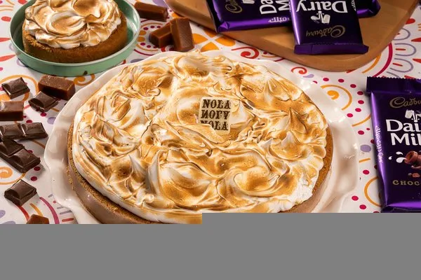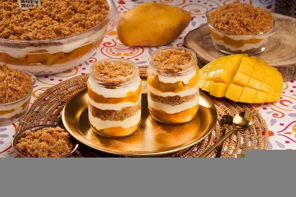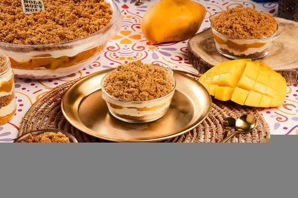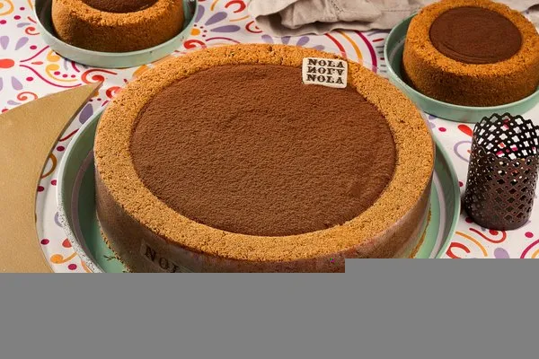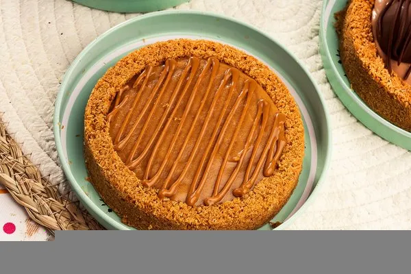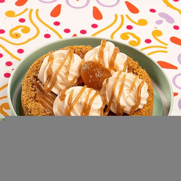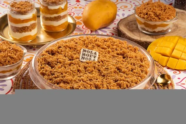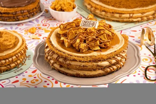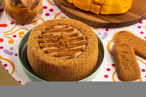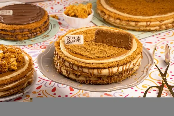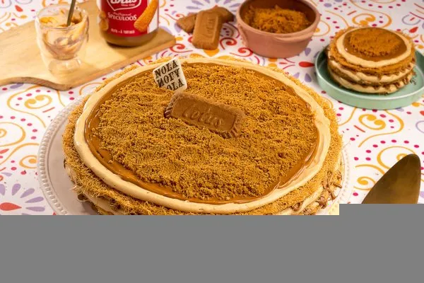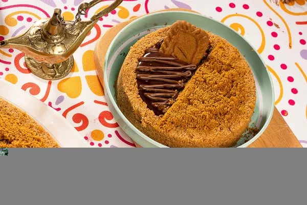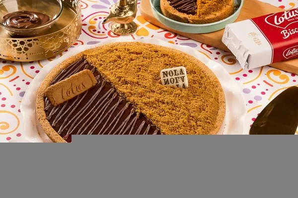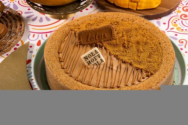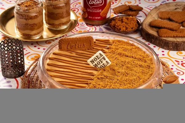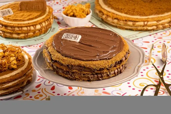 For 10 to 12 persons, 3 layers of konafa, lotus cream cheese, lotus paste topped with lotus paste, crushed lotus biscuit, lotus biscuit piece