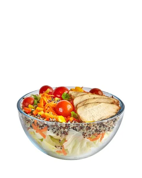 A mixture of red kidney beans, white beans, corn and hummus on a bed of lettuce and parsley dressed with our zesty vinaigrette