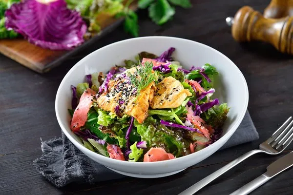 Fried smoked salmon stuffed with shrimps and creamy cheese served with sweet chili sauce