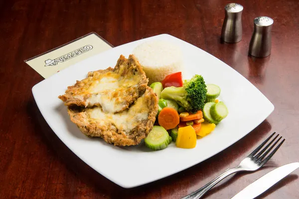 Deep fried chicken breast, topped with marinara sauce, melted mozzarella, parmesan cheese and mayonnaise served on toasted sesame bun and coleslaw